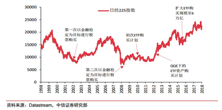 日本央行和香港金管局都买过股票,香港金管局是在1998年亚洲金融危机时,建立平准基金,现在已经退出了。日本央行比较持续,从2002年一直到现在都有买股票ETF的操作。