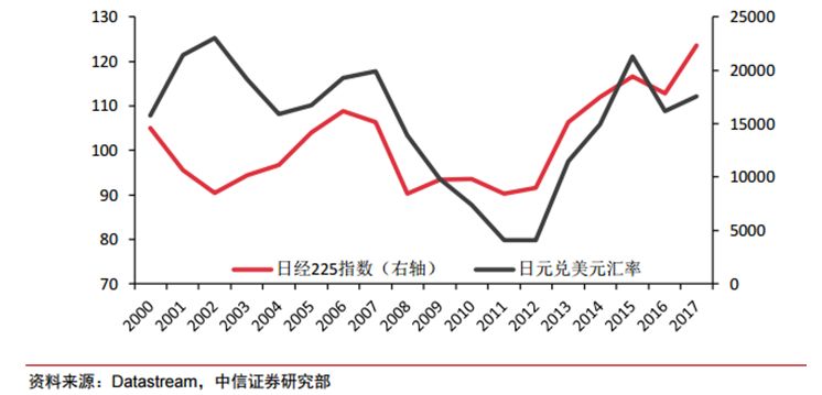 但是最近几年日本股市上涨也并不是都可以归功给日本央行。因为2012年末安倍当选日本首相后,推出了一揽子刺激计划,日元走弱,反过来就刺激了股市(PS:日本股市权重股大多是跨国企业,所以弱日元有助于提升盈利)。