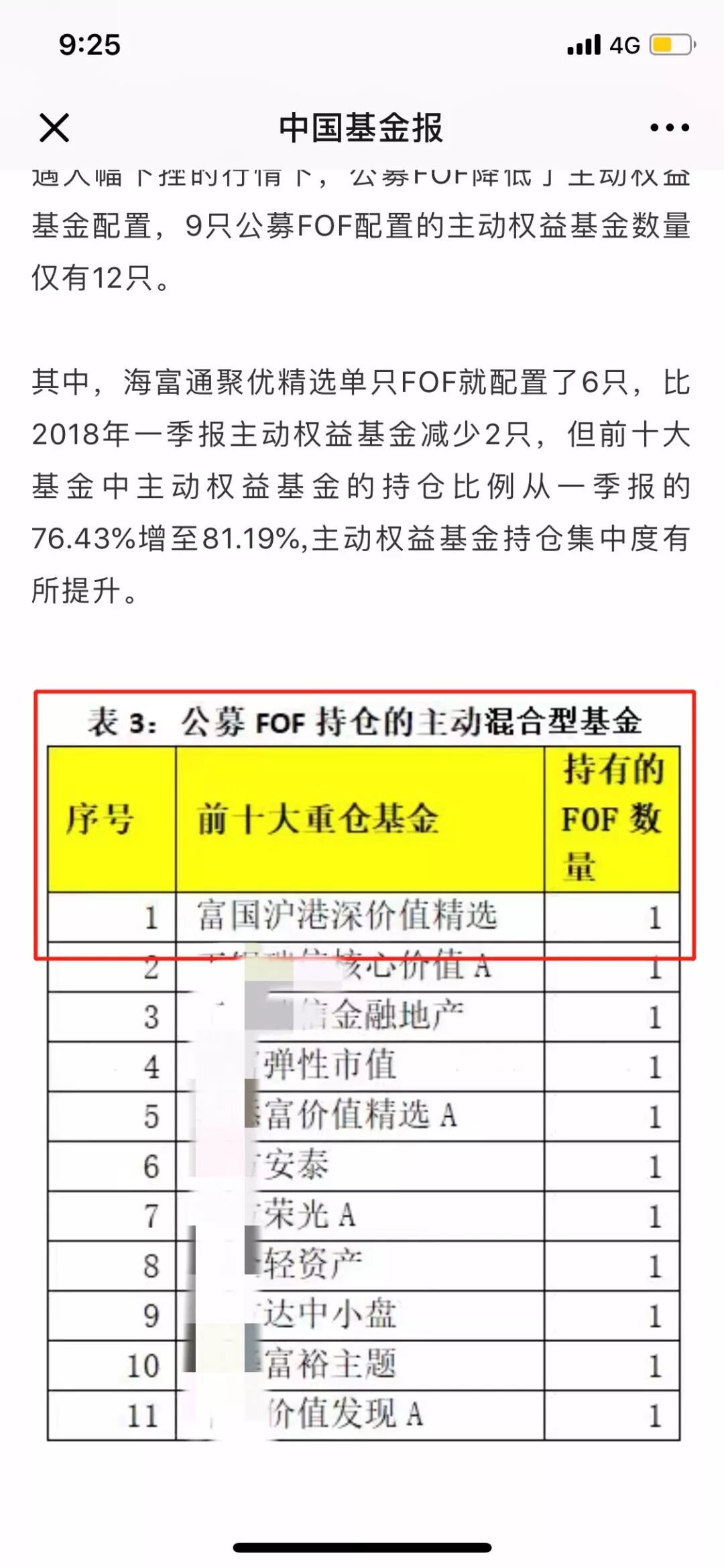 首批FOF基金中分为内部FOF和外部FOF,简单理解就是,在自己公司中挑选绩优基金和在全市场中挑选绩优基金;而在外部FOF中,富国沪港深价值精选获得了其他基金公司的青睐,并重仓持有了。