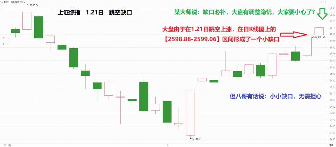 上回提到,上证综指1.21日高开高走,当日最低点为2599.06,与前一交易日1.18日的最高点2598.88略高0.18点,形成了一个极小的没有成交的价格区间,这个价格差就是我们通常说的“缺口”。