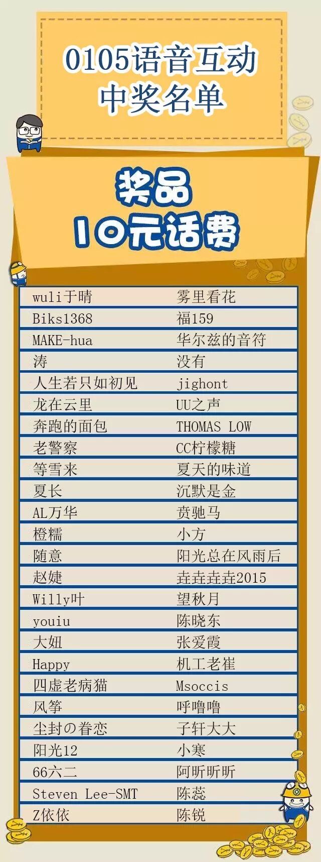 话费将于1月11日(本周五之前)充值到中奖客官后台预留的手机号码中,请各位客官耐心等待~