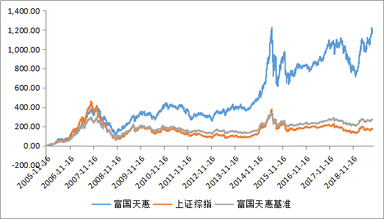 注:富国天惠及其业绩比较基准自2006年至2019年上半年的净值增长率分别为134.37%(77.12%),101.45%(98.58%),-47.34%(-49.44%),75.80%(61.80%),19.37%(-6.64%),-25.30%(-17.46%),6.27%(6.35%),18.18%(-3.13%),25.42%(34.65%),69.23%(7.47%),-15.53%(-7.91%),27.78%(13.96%),-26.96%(-17.09%),39.41%(18.72%)。数据来源:富国天惠年报。