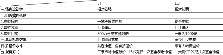 ETF套利效率高,LOF套利的效率低而且难度大。ETF一天内即可完成,而LOF至少需要两天才能完成,如果套利机会两天后消失,投资者就会收到损失。所以ETF的套利机制相对更有效率一些。