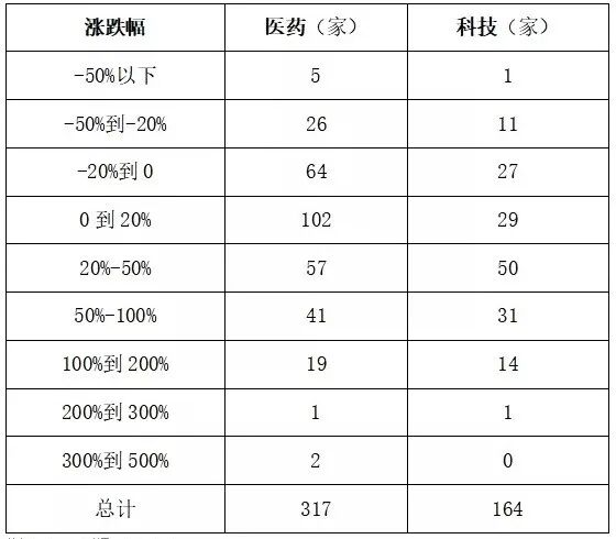 此外,这里还统计了一下今年医药和科技类个股的涨幅区间。数据来自同花顺iFind个股标签,虽然不一定完整,但有一定代表性。