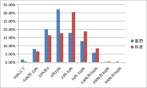 粗粗一看,医药类个股涨幅的重心在0-20%那里,而科技类个股涨幅的重心在20%-50%那里,那应当科技跑赢医药才对。