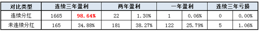 表:连续分红公司的亏损概率较低、连续盈利概率较高