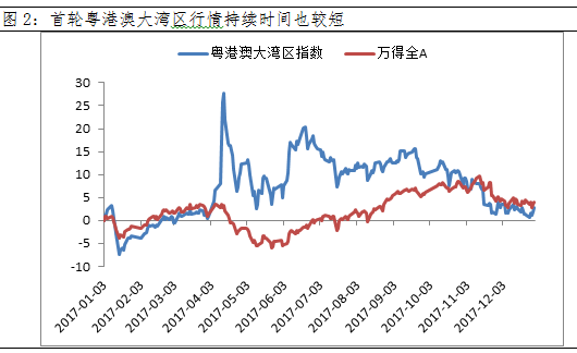 粤港澳大湾区的行情有两波。2017年3月5日,李克强总理在政府工作报告中提出,要推动内地与港澳深化合作,研究制定粤港澳大湾区城市群发展规划。4月,中央决定设立雄安新区,“炒地图”热情高涨,粤港澳大湾区指数当月上涨11.20%。