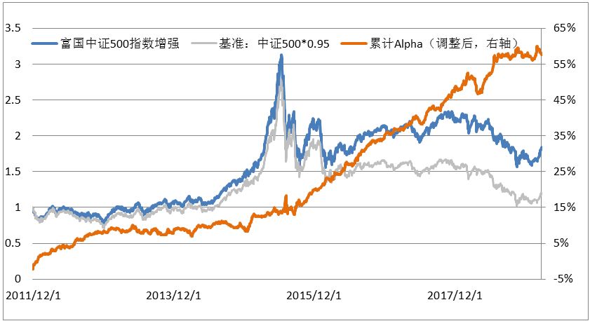 举个例子,富国中证500自成立以来,收益率为84%,而同期中证500指数的收益率仅有25%,也就是说,富国中证500比指数多赚了60%(扣除管理费)。