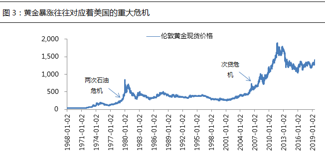 从历史上来看,黄金经历过3次暴涨。第一次是美国大萧条期间,为了放松银根刺激经济,罗斯福在1933年宣布美元与黄金脱钩,黄金随之大涨。第二次是在两次石油危机期间,美国出现严重滞涨的局面,黄金价格在此期间大涨。第三次是在次贷危机之后,美联储陆续推出三轮QE政策,黄金价格因此大涨。综合以上3次黄金暴涨的经验,黄金的大行情往往对应着美国的重大危机。