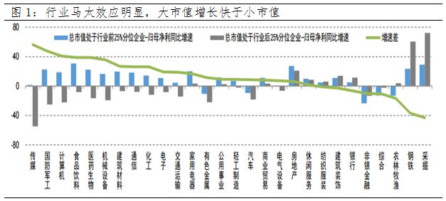 行业表现呈现马太效应,2018年末A股上市企业总市值中位数为40亿,但总市值在40亿以下的上市公司营收和归母净利的同比增速中位数分别为8.8%和-4.8%,远低于市场整体增速(10.7%和2.8%)。