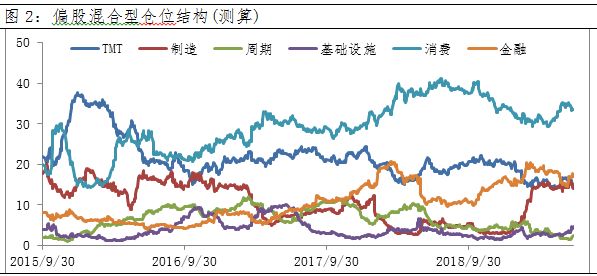 截至目前,股票型及偏股混合型基金测算仓位分别为86.52%、88.32%,处于中性偏高的位置。配置上,偏股混合型基金在2月以来增加制造板块,近期保持平稳;对于消费板块在2018年三季度末由于增速下滑大幅调低消费仓位,但随着“抱团取暖”,5月以来消费仓位有所上升,处于较高水平。其他板块中今年以来对于金融“青睐有加”,TMT及周期仓位下滑。
