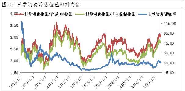 2019年A股市场估值中枢仍在低位,多数行业估值仍处历史中值以下,地产、建材估值接近历史最低水平,但高估值个股数量明显增加,估值分化明显。在资金抱团取暖的日常消费领域,绝对估值达到37.95倍,相对于沪深300估值和上证综指估值为3.07倍(均值2.63倍,最大3.64倍,最小1.74倍)、2.85倍(均值2.38倍,最大3.32倍,最小1.63倍),处于历史相对较高的位置。