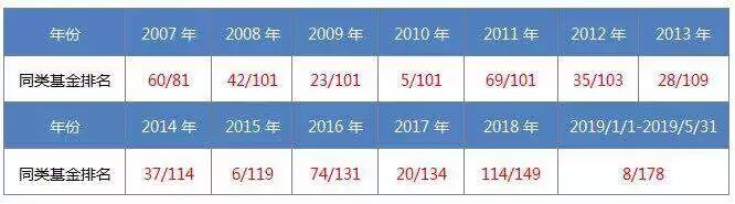 (数据来源:中国银河证券基金研究中心,截至2019年5月31日,① 同类排名的类别为普通偏股型基金(A类)② 2006年数据不全 ③ 排名根据年度净值增长率)