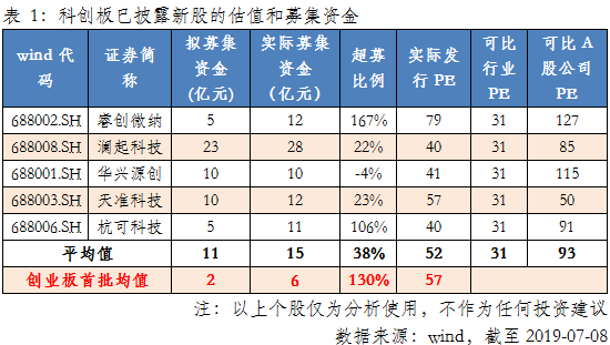 从估值看,科创板定价较为“理性”。第一,整体来看,目前已披露的5家公司的超募比例为38%,相对创业板130%的超募比例较低;第二,从市盈率看,虽然这5家均高于可比行业,但相对A股可比公司,大部分“折价”明显,而且平均水平低于创业板首批的均值。