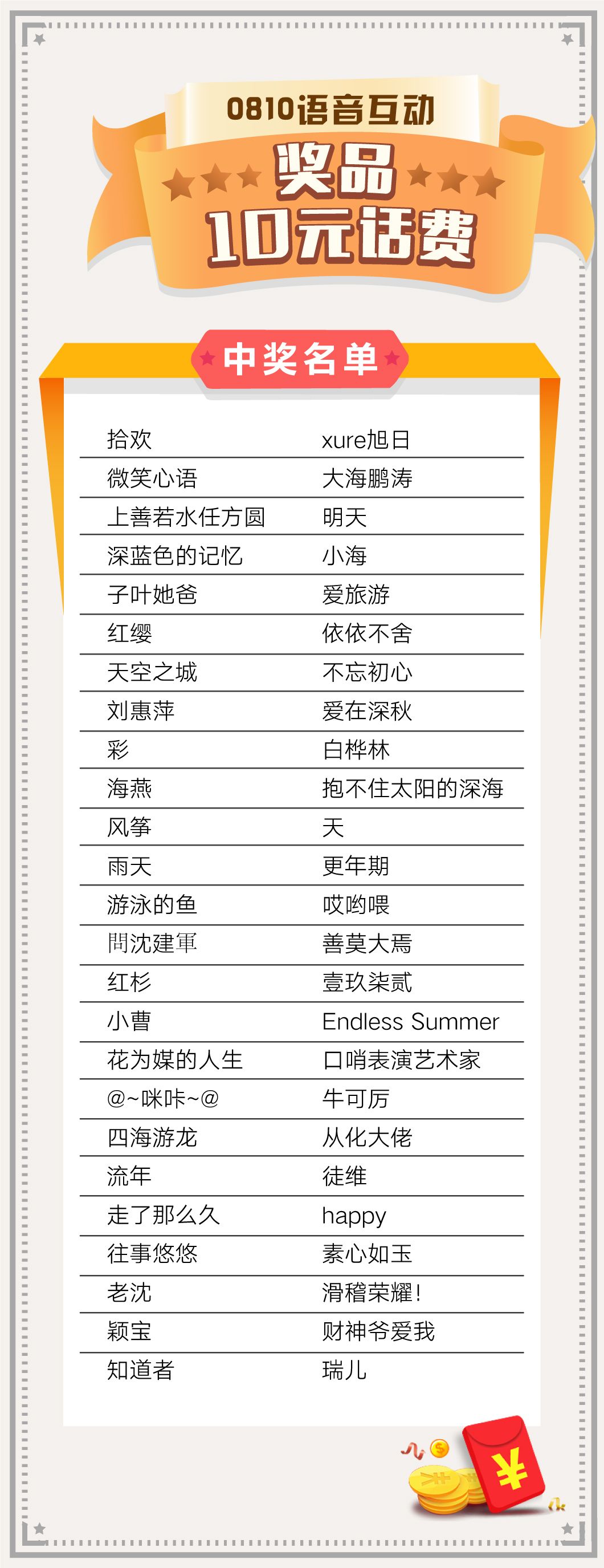 话费将于8月16日(本周五之前)充值到中奖客官后台预留的手机号码中,请各位客官耐心等待~