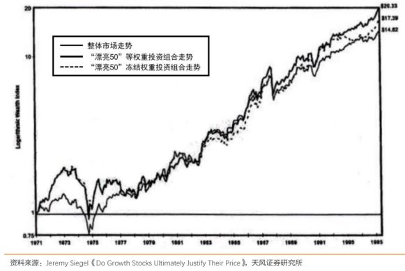 但是,这只是一个方面。还有一个方面是,在此期间,美国的“漂亮50”走的不要太漂亮。统计了一下,从1970年-1995年这25年间,“漂亮50”总回报率超过美股整体37%,走势也是一马平川、抬头向上。