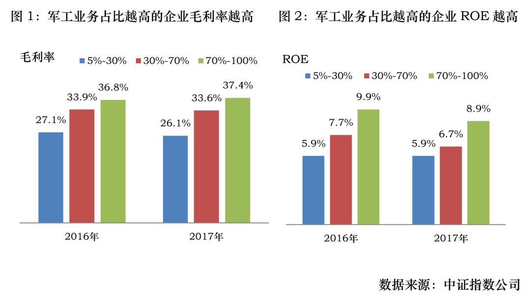 中证指数提供的数据显示,军工业务是一项毛利率和 ROE 都比较高的业务,军工股中的军工业务占比越高,财务数据就越漂亮。