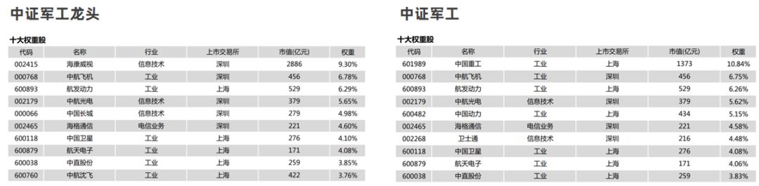 比如军工龙头指数的第一大权重股是海康威视,而在中证军工中十大不入;同样中证军工的第一大权重股是中国重工,而在中国军工龙头指数中同样是十大不入。