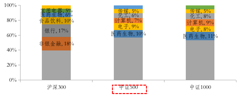 ✔ 从行业分布看,沪深300以“大金融和大消费”为主;而中证500和中证1000以“医药+TMT”为主。