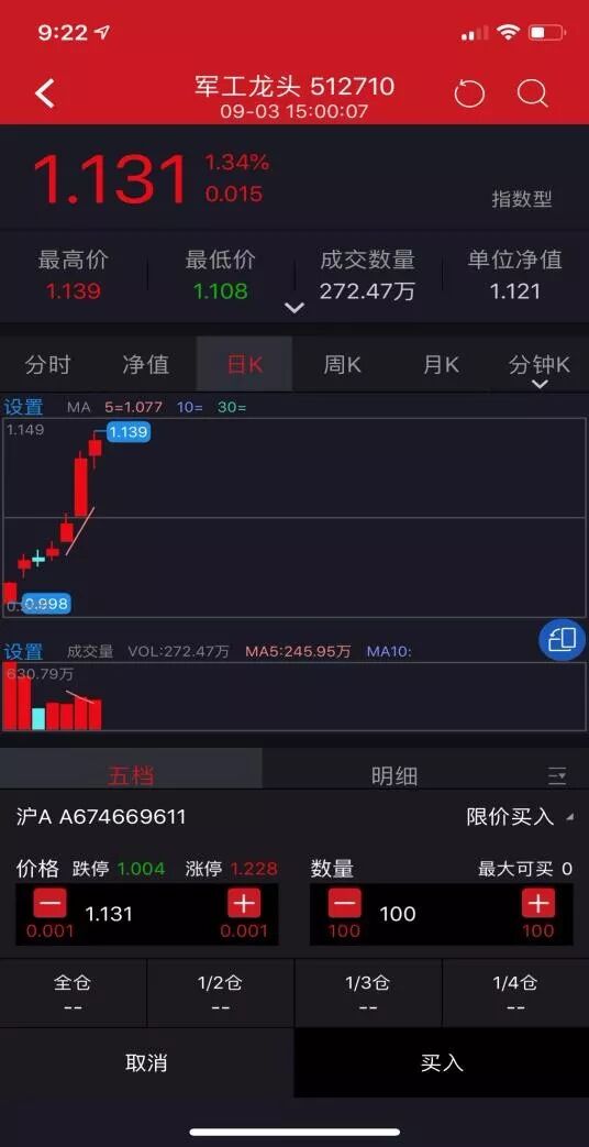 然后,客官们只要在自己的股票交易APP中输入代码512710,即可找到军工龙头ETF的行情页面,然后点击“下单”,输入想要买入的份额和价格,即可下单成功。