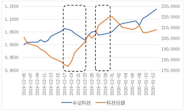 很明显的可以看出,科技指数(蓝线)下跌或者横盘的时候,科技份额(呈现)有很高的提升。