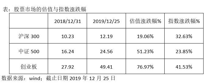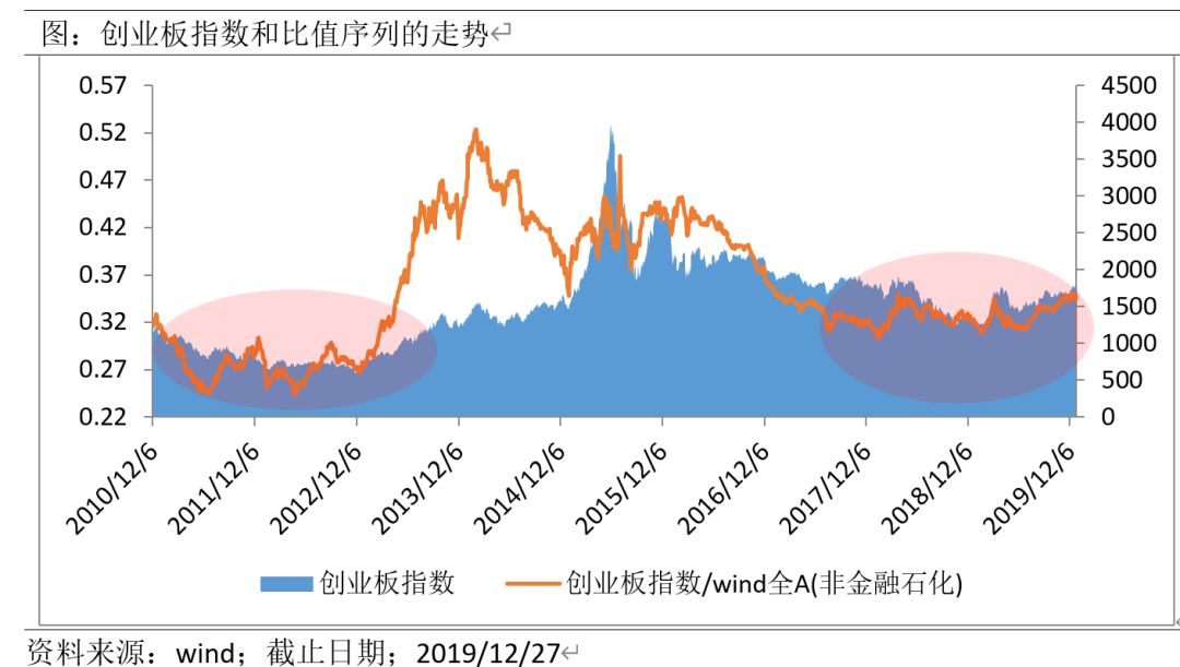 大家有人说2019年创业板涨得比较好,我想说只是由于充分的换手之后,新增的增量资金往里面流入。A股市场目前的资金量很有限,从一个板块流出,流向另外一个板块,是这样的情况。所以我们看到创业板指数,相对大盘来说,是蠢蠢欲动。