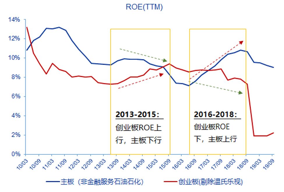 大家看上图的那根橙色线,这根线还是很能说明问题的。橙色线是创业板指和大盘的比值,反应了是创业板相对于大盘的强弱。在这个比值序列上,我框了两个方框,一个方框是2010年到2012年的方框,整个创业板相对于大盘纠结了一两年的时间。第二个阶段是从2015年股市下行之后,整个创业板,先杀股指,再杀盈利,再杀估值,再杀盈利。