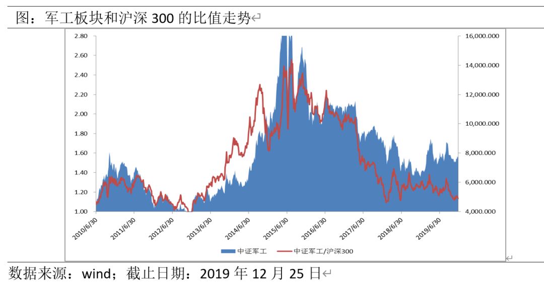 从资本市场来看,军工板块和大盘的比值序列基本上处于历史的最低点附近,再结合基本面的上升,军工板块在2020年或许值得期待。
