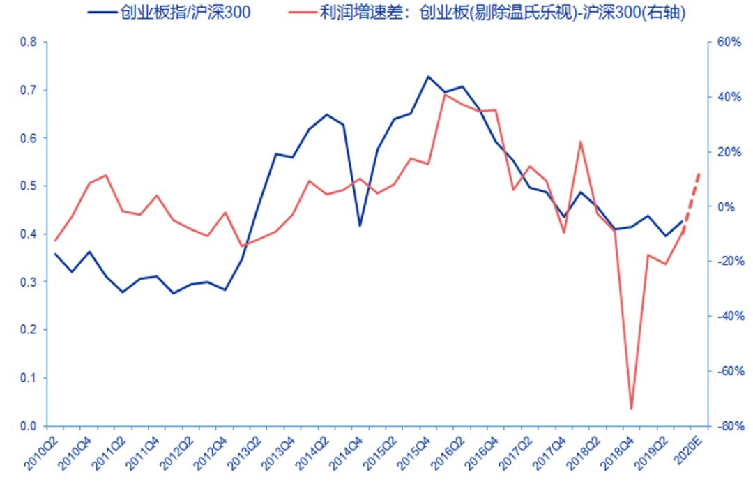 大家看这张图很有意思。这张图蓝色线是创业板指和沪深300的比值,红色线是创业板的盈利减去沪深300盈利。相当于业绩上和股票市场的表现,大家发现趋势是一致的,也就是业绩差异会导致风格差异。