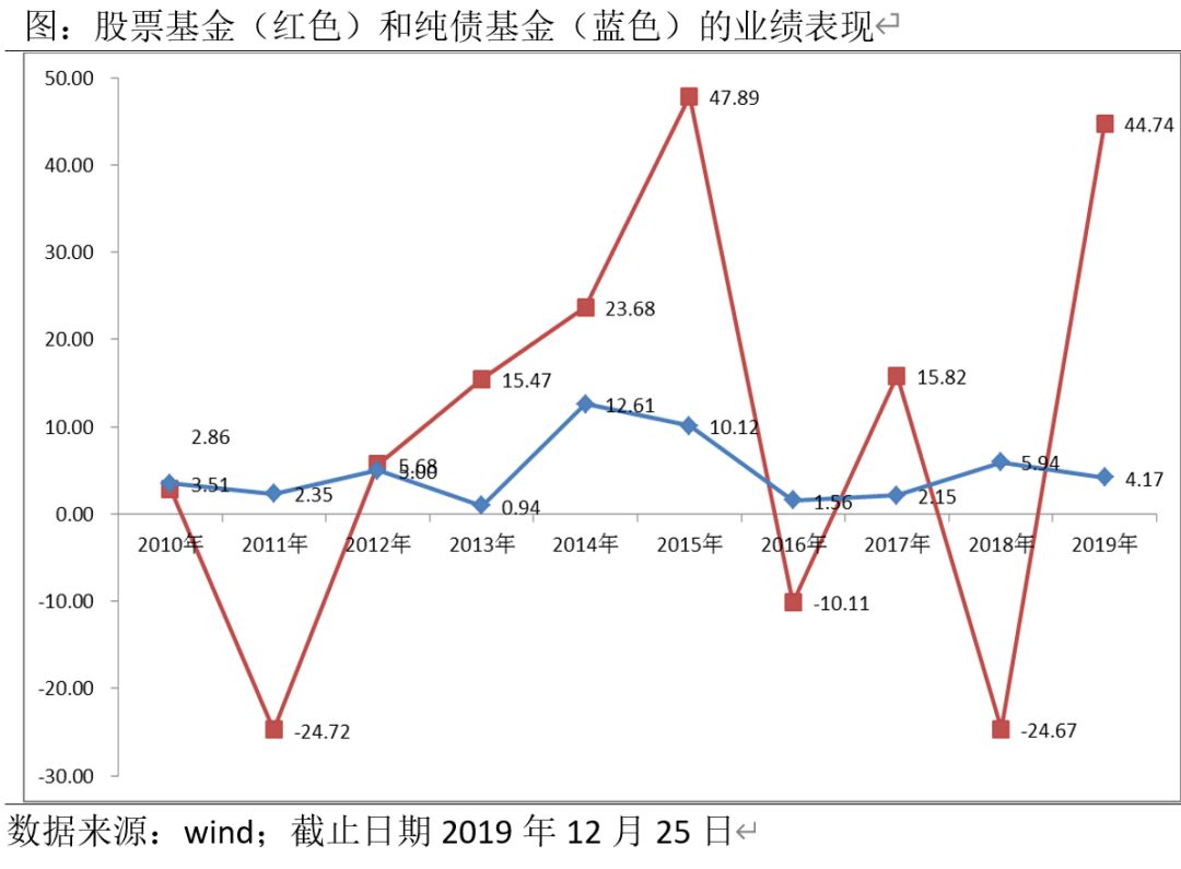 虽然很多2019年的公募主动股票基金的平均回报率大概在44.74%。从主动股票基金的收益率的历史数据来看, 2019年的确是一个大年,超过了2014年、和2015年基本相当。