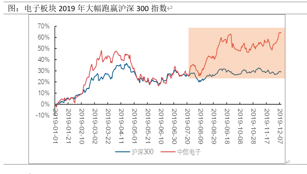 另外是电子板块,2019年涨得非常不错。但是2019年的电子板块是两个阶段,