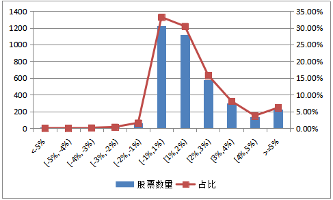 2. 大多数股票收益还是集中在下跌1%到上涨1%之间,眼看指数涨得那么好,其实微涨微跌、趴着不动才是今天A股的主旋律;