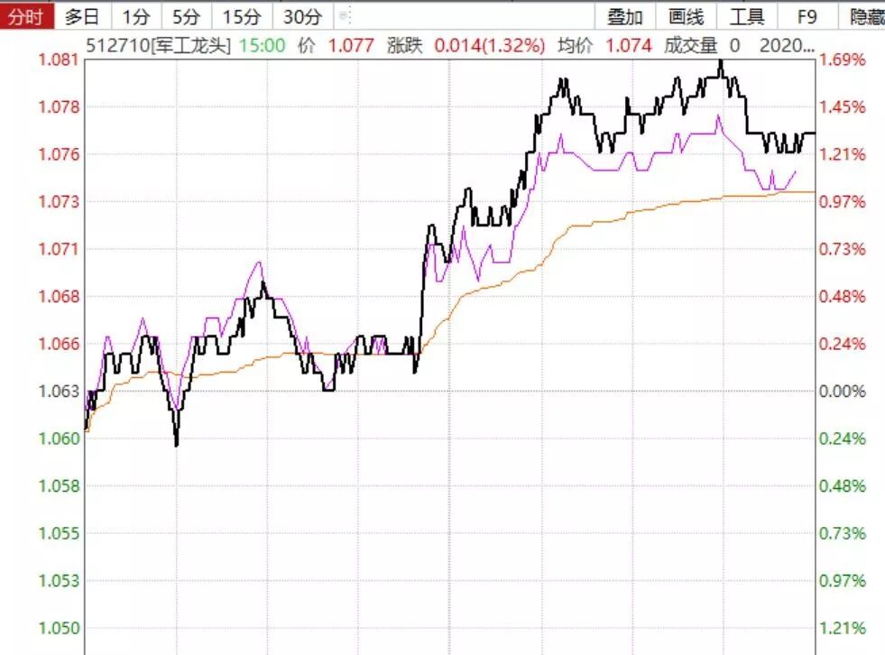 今天军工出人预料的扛起了A股的大旗,军工龙头午盘临近收盘时突然狂拉,且直到收盘,都一直大幅溢价,最终军工龙头ETF收涨1.32%,成交额破2.2亿元。