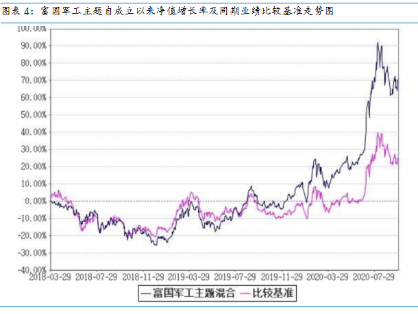 富国军工主题成立于2018-3-29,业绩比较基准为中证军工指数收益率×80%+中债综合全价指数收益率×20%。富国军工主题基金成立日至2018年12月31日、2019年、2020上半年基金业绩及同期比较基准收益分别为:-25.22%(-20.32%)、38.69%(18.21%)、23.82%(8.21%)。