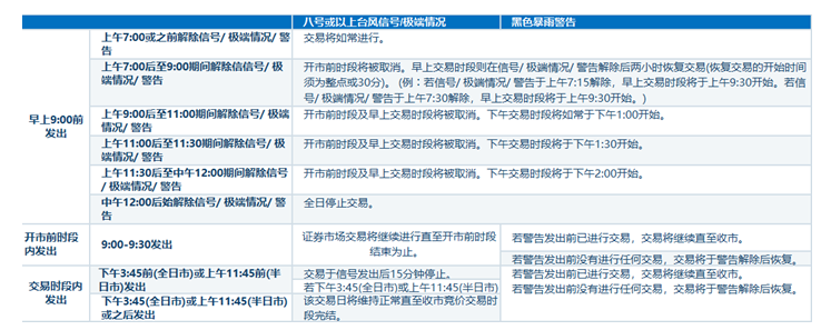 注:根据港交所官网发布的关于台风、极端情况及黑色暴雨期间的交易安排摘录整理而来。开市前时段、交易时段发出的解除场景参考早上9:00前发出有关警告解除后恢复交易之安排。