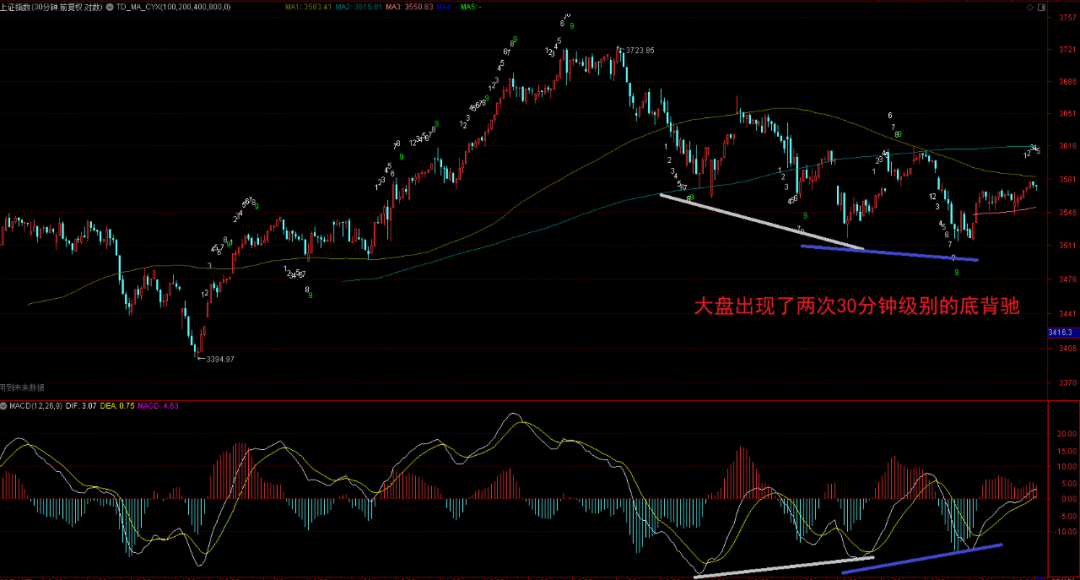 国庆之后,市场曾有高开低走的迹象,但是随后大盘经过三针探底并已出现了两次30分钟级别的底背驰,因此八哥认为前期的调整大概率已告一段落。