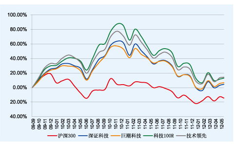 国内市场高科技相关板块近年来表现不俗。自2009年9月以来,深证科技指数、技术领先指数、巨潮科技指数、科技100R指数等4个科技类指数累计收益率平均超越沪深300指数24个百分点,科技概念指数收益率总体战胜大盘收益率。