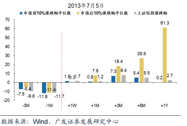 图:2013年7月证监会鼓励并购重组、放松管制后大小盘涨幅