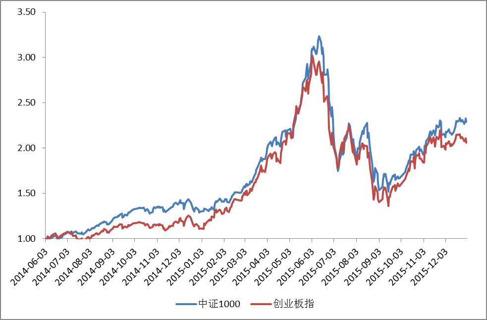 图:2014年牛市中证1000指数与创业板指涨幅对比