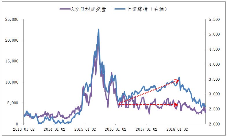 ❷ 在熊市中,成交量往往随指数下跌而不断萎缩(例如今年2-10月,随着市场的下跌,成交量不断走低);