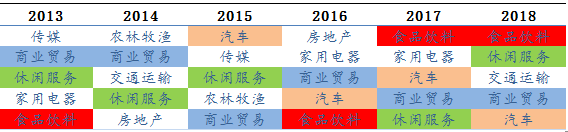 表1:2013-2018年国庆前10个交易日,涨幅前五的消费行业