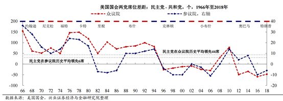 1966 年至 2018 年,民主党在参议院和众议院分别平均领先 6 席和 44 席;