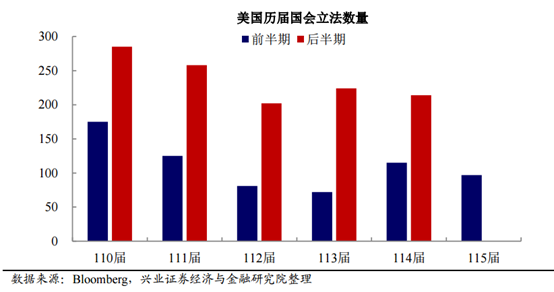 而根据历史数据,美国国会后半期的立法数量往往高于前半期。