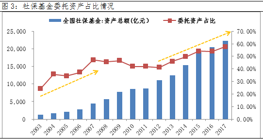 除了投资的多元化,社保基金在2003年以后委托给专业资产管理人的比例逐年上升,2017年年底委托投资占比已经达到了57.65%的水平。在这个“多变”的市场中,怎么做到不被“撸羊毛”,社保基金的运营方式也给普通投资者一定的启示。