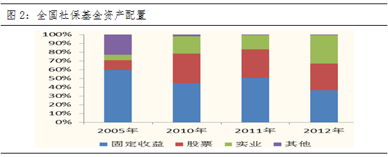 不要把鸡蛋全部放在同一个篮子,这是人人都知道风险分散的道理,但这样的投资态度并不是人人都可以做到。全国社保基金除了强调“安全”,在投资过程中运用资产配置理念,虽未能获得最高回报,但在风险承受范围内获得了稳健的回报。其中,全国社保基金2012年中固收类配置占比36.7%、股票类配置30.2%、实业类配置32.4%。(由于数据可得性原因,采取2012年为例子)