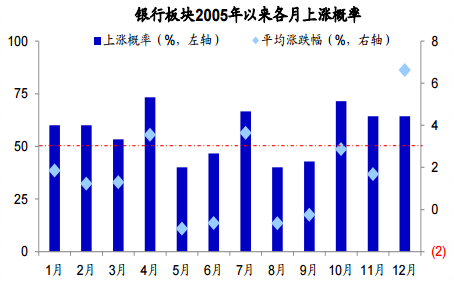 季节因素。历史上看,银行板块岁末年初常有行情。2005年以来的10月份,银行上涨概率接近75%,平均涨幅在3%左右。当然,季节因素不仅仅是玄学那么简单。