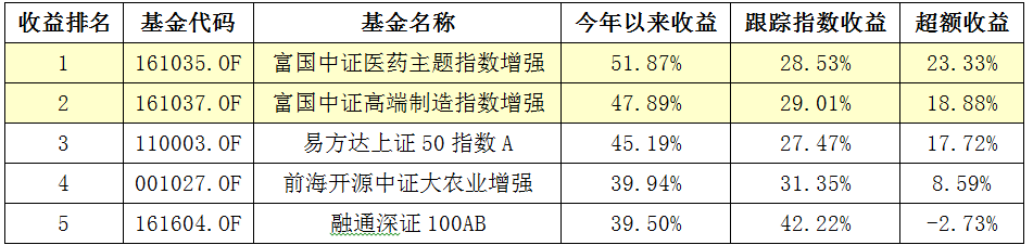 在全市场70只指数增强基金中,今年收益最高的是富国医药增强和富国高端制造,绝对收益分别为52%和48%。