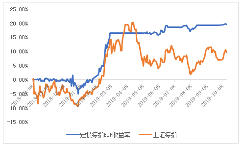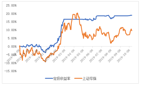 从2018年10月开始定投,截止今日,上证综指的定投收益率为19.03%,而上证综指本身收益率为9.65%,超额收益为9.38%。虽然在今年这种行情下,19.03%的收益率不算高,但从下图中的收益曲线来看,收益的波动较低、确定性比较高。