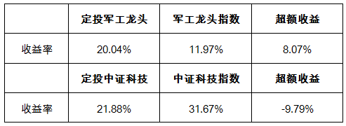 数据显示,同时期同体系下定投军工龙头指数的收益率为20.04%,相对一把梭取得的11.97%的收益,提升了8.07%;