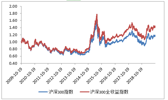 图:沪深300价格指数和全收益指数近十年的走势对比